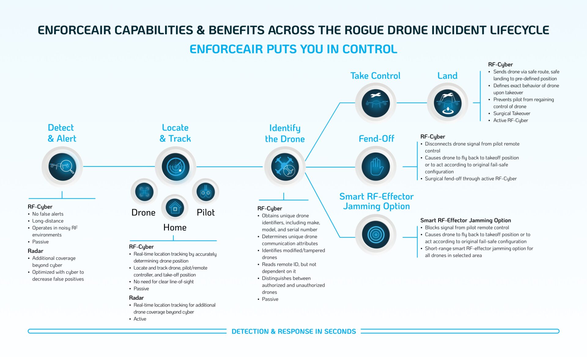 Eftersom ett system sällan klarar allt så är EnforceAir utvecklat i flera lager. Utöver cyber-lagret finns även störsändare, radar och kameror för att fånga upp de drönare som inte finns i biblioteket.